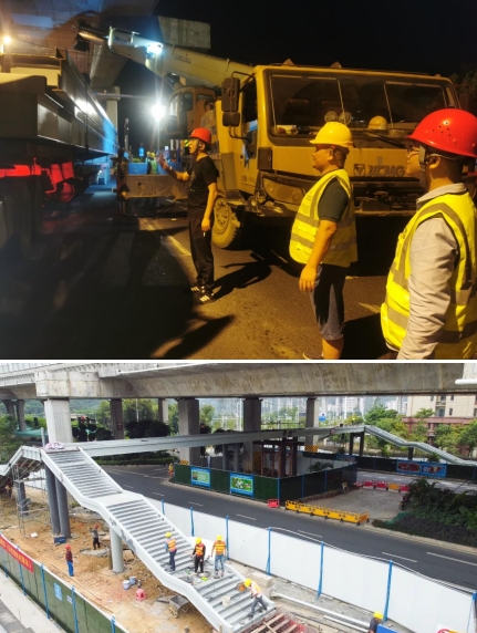 由于人行天橋項目建設(shè)所處的位置地下含高壓線等管線,施工環(huán)境較為復(fù)雜,且又處在交通通行量大的東環(huán)高速高架橋下,由于空間受限,鋼箱梁吊裝與高架橋最近的距離僅有5公分,吊裝難度極大。為此,我們采取雙吊車協(xié)同施工、錯峰施工和夜間施工的辦法。為確保施工安全,市政集團(tuán)從上至下高度重視,由集團(tuán)領(lǐng)導(dǎo)帶隊,項目總工及各職能部門主要人員齊上陣,從交通協(xié)調(diào),運梁車跟隨指導(dǎo),安全措施落實及現(xiàn)場架梁的線位等多方面進(jìn)行把控,主要負(fù)責(zé)人靠前指揮,帶領(lǐng)黨員干部及時協(xié)調(diào)解決吊裝過程中遇到的問題,充分發(fā)揮出黨支部戰(zhàn)斗堡壘和黨員的模范帶頭作用。