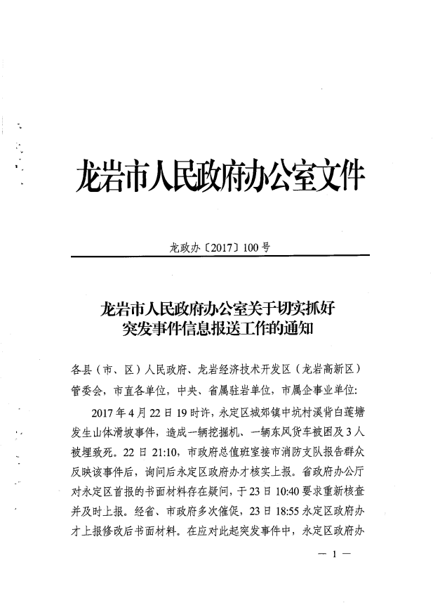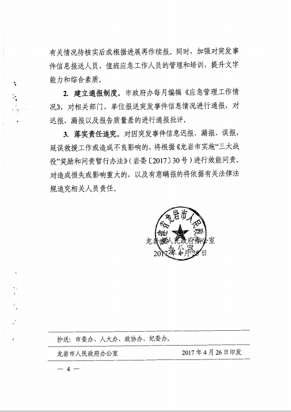 市政府辦關(guān)于切實(shí)抓好突發(fā)事件信息報(bào)送工作的通知(龍政辦【2017】100號(hào))