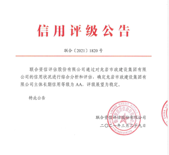 2021年3月29日,經(jīng)國(guó)內(nèi)權(quán)威評(píng)級(jí)機(jī)構(gòu)聯(lián)合資信評(píng)估有限公司評(píng)級(jí)專家集體分析、研究、決議,一致通過(guò)給予龍巖市政建設(shè)集團(tuán)有限公司AA主體信用評(píng)級(jí),評(píng)級(jí)展望穩(wěn)定。